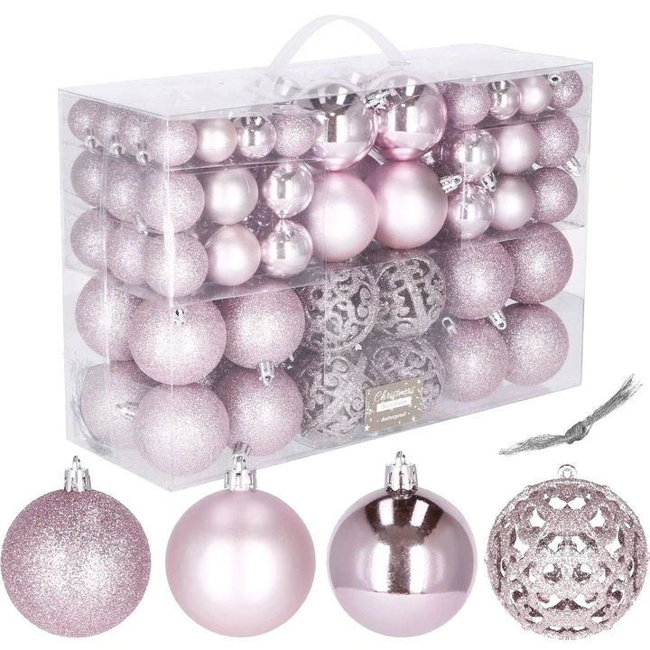 Springos 100 darabos karácsonyi gömb készlet karácsonyfához, akasztókkal, műanyagból, átmérő 3/4/6 cm, rózsaszín
