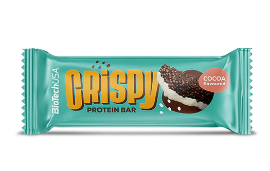 Fehérje szelet kakaós tejfehérje extrudátumból, fehérbevonó talppal, keksz darabokkal, cukrokkal és édesítőszerekkel.